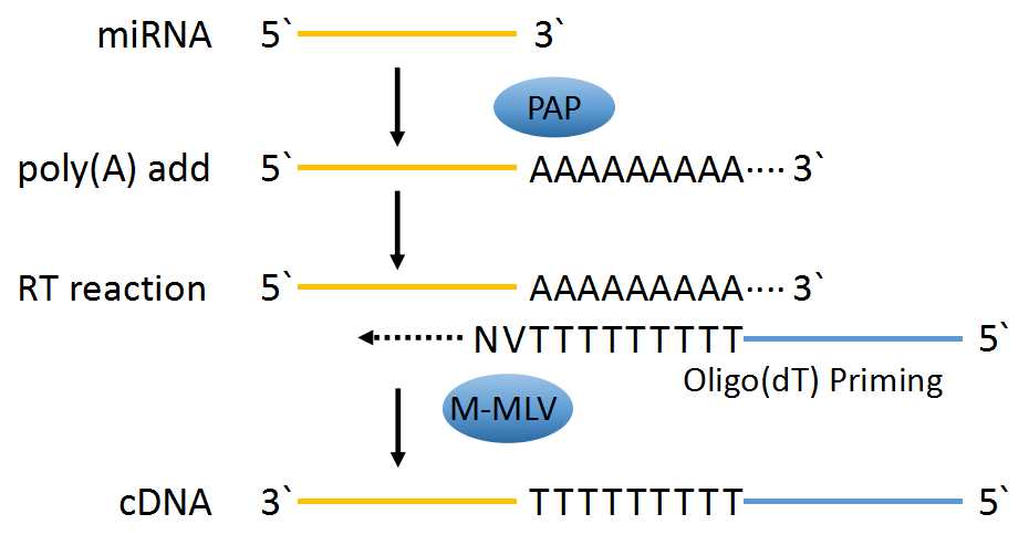 本產(chǎn)品以總RNA或miRNA為模板,先通過(guò)Poly(A)聚合酶在miRNA的3`端加多聚A尾,隨后使用Universal Oligo(dT) Primer進(jìn)行逆轉(zhuǎn)錄反應(yīng),最終生成miRNA對(duì)應(yīng)的cDNA第一鏈。