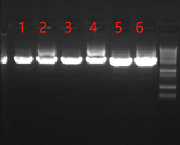挑取單斑下提取質(zhì)粒圖:1-6分別為7h的DH5α,7h的K1,8h的DH5α,8h的K1,過(guò)夜的含氨芐抗性質(zhì)粒的DH5α,K1。