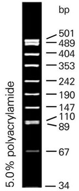 本產品是即用型由pUC19質粒經MspI完全酶切得到的,包括501,489,404,352,242,190,147,110,110,89,67,34bp DNA片段,適用于瓊脂糖或聚丙烯酰胺凝膠電泳中DNA條帶的分析。