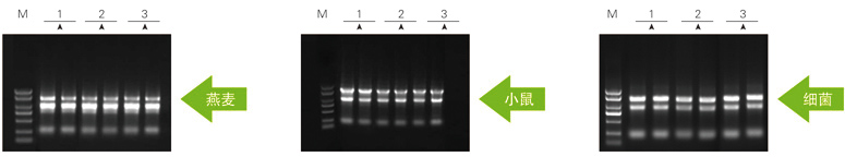 以上參考圖分別取50mg燕麥葉片,20mg小鼠肝臟和1ml細(xì)菌DH5α菌液各數(shù)份,組織進(jìn)行液氮研磨處理,菌液離心收集細(xì)胞后,分別加入1ml Zomanbio RNApure 和 T、I公司相應(yīng)產(chǎn)品,按各自說明書進(jìn)行RNA提取。洗脫體積分別為80μl、100μl、60μl。RNA電泳上樣量分別為5μl,1%瓊脂糖凝膠電泳。