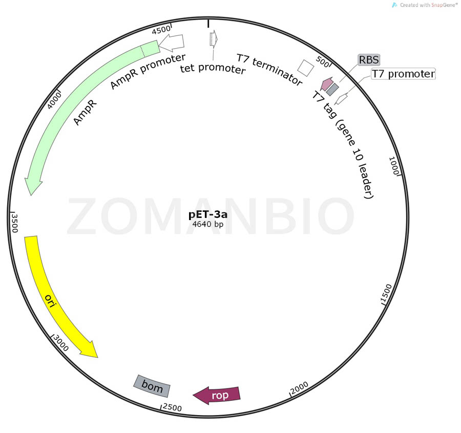 pET-3a載體是一個大腸桿菌表達載體,T7啟動子驅動T7標簽和目的基因融合表達。該載體是組成型表達,并且不攜帶6×HIS標簽。The pET-3a-d vectors carry an N-terminal T7?Tag sequence and BamH I cloning site. These vectors are the precursors to many pET family vectors; the pET-23a-d(+) series corresponds to pET-3a-d but incorporates several additional features. Unique sites are shown on the circle map. Note that the sequence is numbered by the pBR322 convention, so the T7 expression region is reversed on the circular map. The cloning/expression region of the coding strand transcribed by T7 RNA polymerase is shown below. 質粒只保證關鍵序列正確,不保證表達效果。
