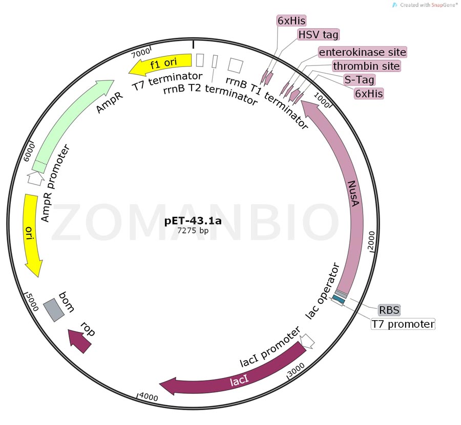 The pET-43.1 series of vectors are designed for cloning and high-level expression of peptide sequences fused with the 491 aa Nus?Tag protein. Unique sites are shown on the circle map. Note that the sequence is numbered by the pBR322 convention, so the T7 expression region is reversed on the circle map. The cloning/ expression region of the coding strand transcribed by T7 RNA polymerase is shown below. The f1 origin is oriented so that infection with helper phage will produce virions containing single stranded DNA that corresponds to the coding strand. Therefore, single stranded sequencing should be performed using the ColiDOWN primer. Vector encoded sequence can be completely removed when cloning into the PshA I or Sma I sites (as shown below) by cleaving the Nus?Tag fusion protein with enterokinase or thrombin, respectively. 質(zhì)粒只保證關(guān)鍵序列正確,不保證表達(dá)效果。