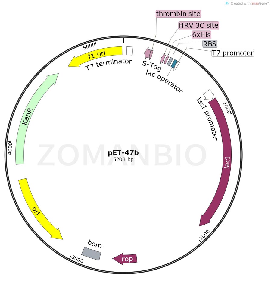 pET47b載體攜帶有N端His純化標簽,緊跟著有一個HRV 3C蛋白酶切位點。這個HRV 3C蛋白酶切位點能夠特異性的高效 切割 “LEVLFQ↓GP”氨基酸序列,酶活力在低溫下很強。pET-50b(+)載體上還含有一個可選擇的C端Thrombin蛋白酶切位點和S標簽序列。