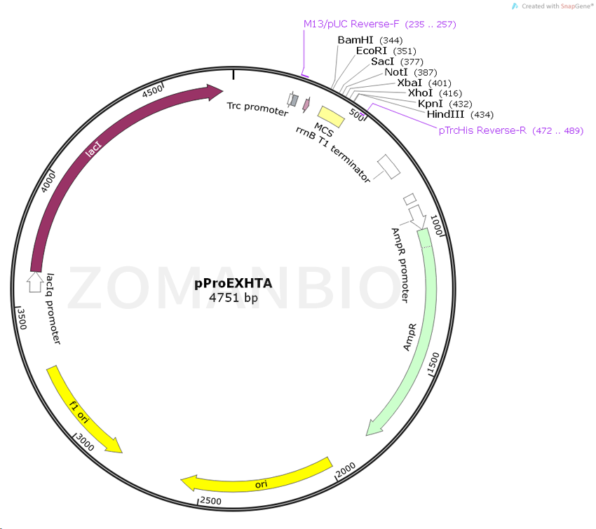 pProEX HT系列原核表達(dá)質(zhì)粒是用來在大腸桿菌中表達(dá)外源蛋白的載體。使用該質(zhì)粒表達(dá)的目的蛋白含有6個His純化標(biāo)簽。目的基因可以克隆到載體的多克隆位點處,可以選擇的載體有pProEX HTa, b, c.蛋白表達(dá)后,His純化標(biāo)簽就位于目的蛋白的N端,同時His純化標(biāo)簽的使用可以用于蛋白純化。載體上同時含有rTEV蛋白酶識別位點,可以使用rTEV蛋白酶進行酶切,從而去除融合的His標(biāo)簽。 質(zhì)粒只保證關(guān)鍵序列正確,不保證表達(dá)效果。