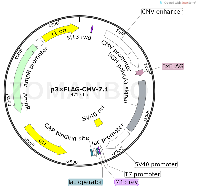 pp3XFLAG-CMV-7.1 Expression Vector is a 4.7 kb derivative of pCMV5 used to establish transient intracellular expression of N-terminal 3XFLAG fusion proteins in mammalian cells. The vector encodes three adjacent FLAG epitopes (Asp-Tyr-Lys-Xaa-Xaa-Asp) upstream of the multiple cloning region. This results in increased detection sensitivity using ANTI-FLAG M2 antibody. The third FLAG epitope includes the enterokinase recognition sequence, allowing cleavage of the 3XFLAG peptide from the purified fusion protein.