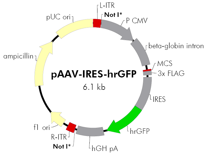 該質(zhì)粒pAAV-IRES-hrGFP載體含有在哺乳動物細(xì)胞中基因的高水平表達(dá)的CMV啟動子和其他元素時。該載體還包含構(gòu)建反向末端重復(fù)序列(ITRS),其中直接病毒復(fù)制和包裝。質(zhì)粒pAAV-IRES-hrGFP可容納插入≤1.7 KB。