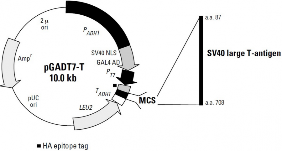 pGADT7-T encodes a fusion of the SV40 large T-antigen (a.a. 86–708) and the GAL4 AD (a.a. 768–881). The SV40 large T DNA (GenBank Locus SV4CG) was derived from a plasmid referenced in Li & Fields (1993) and was cloned into pGADT7 using the EcoR I and Xho I sites. pGADT7-T has not been sequenced.