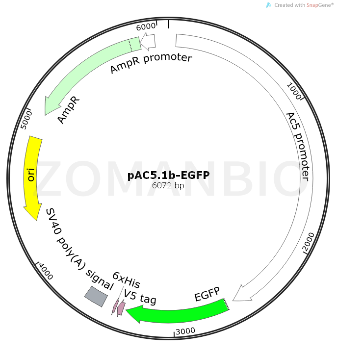 pAC5.1b-EGFP is a 6kb expression vector designed for use with the Drosophila Constitutive Expression System available from Invitrogen. Upon transfection, the vector allows transient expression of your protein of interest in Drosophila cells. When cotransfected with the selection vector, pCoHygro or pCoBlast, pAC5.1b-EGFP allows selection of stable cell lines exhibiting constitutive expression of the protein of interest.