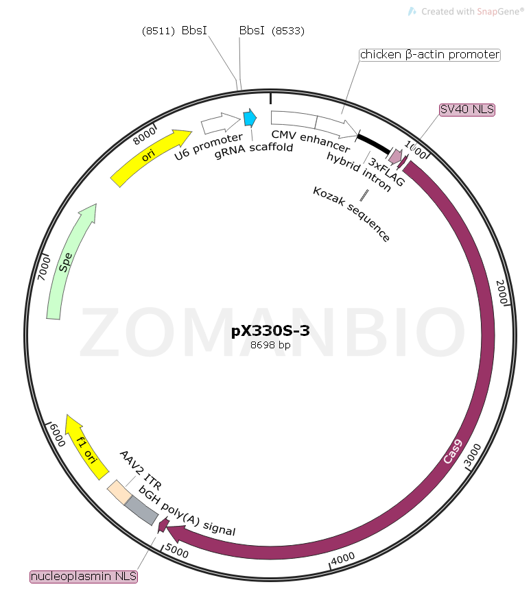 pX330S-3是一個哺乳細(xì)胞CAS9和gRNA表達(dá)質(zhì)粒。