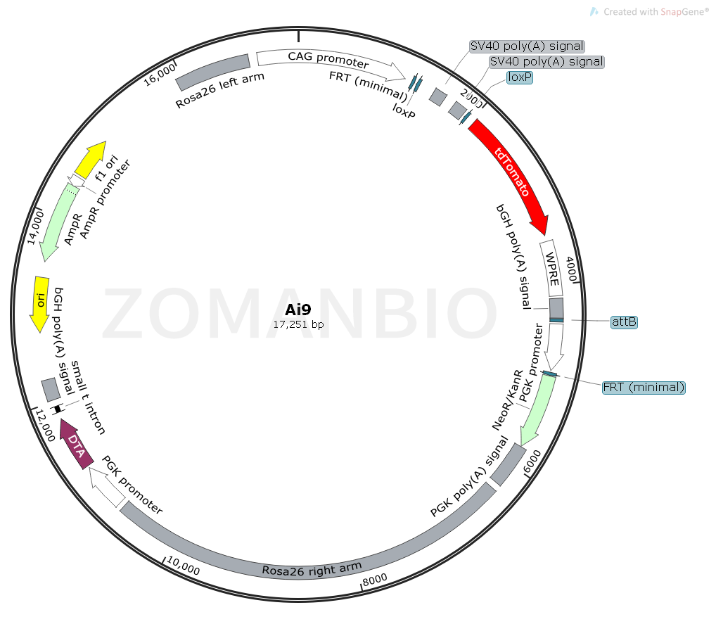 Ai9是一個哺乳細胞紅色熒光蛋白表達質粒。。