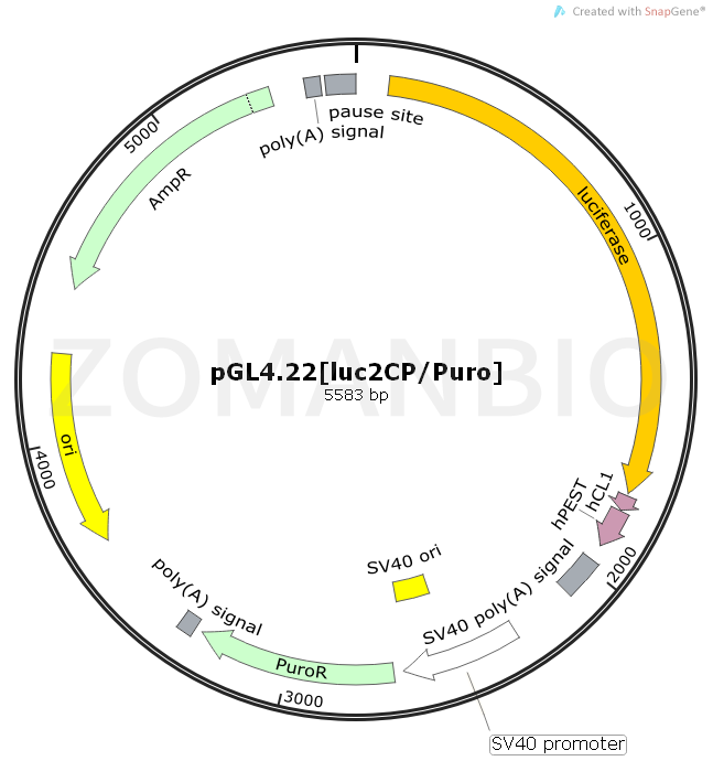 pGL4.22[luc2CP/Puro]是一個哺乳細胞單熒光素酶報告質(zhì)粒。The pGL4.22[luc2CP/Puro] Vector encodes the luciferase reporter gene luc2CP (Photinus pyralis) and is designed for high expression and reduced anomalous transcription. This vector contains a mammalian selectable marker for puromycin resistance in which the number of transcription factor binding sites has been reduced and mammalian codon usage optimized. The vector is engineered with fewer consensus regulatory sequences for reduced background and a decreased risk of anomolous transcription and has a synthetic reporter gene, which has been codon optimized for mammalian expression. The pGL4.22[luc2CP/Puro] Vector is a basic vector with no promoter. However, it contains a multiple cloning region that allows cloning of a promoter of choice. The luc2CP reporter gene contains two protein destabilization sequences, hCL1 and hPEST. The protein encoded by luc2CP responds more quickly and with greater magnitude to changes in transcriptional activity than the luc2 gene, its more stable counterpart.